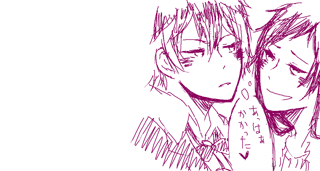 記事が全部ふっとんでやるきがなくなってやめました。 でも今日はデュラのDVD2巻がきてたのでハッピーです(笑 イザシズイザ← もう鼻血の2巻ですよ!しずちゃんの学ランがすごいいい! あとでじっくり見たいと思いますb この前の下書きの絵ができたんでのっけます。 背景の色がなんともいえない赤ピンク。 そして血がエイリアン(笑 そういやもうすぐ友達の誕生日だ・・・絵できてない・・・描かないと。 続きにこの前した絵ちゃログぶっこんどきます、とその前に返事。 >衣咲さん メイキングってほどのものでもないんですよ(●´д`●) いえいえいえ私のなんて細かいとこまで教えるほどじゃないですよ! まだまだ研究段階なので・・・・。 いちお完成しましたが目に悪いです(笑